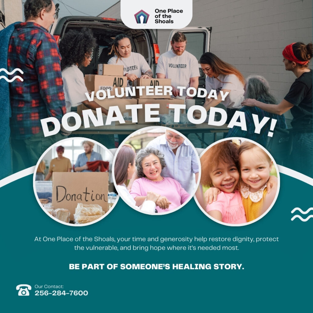At One Place of the Shoals, your time and generosity help restore dignity, protect the vulnerable, and bring hope where it’s needed most.
